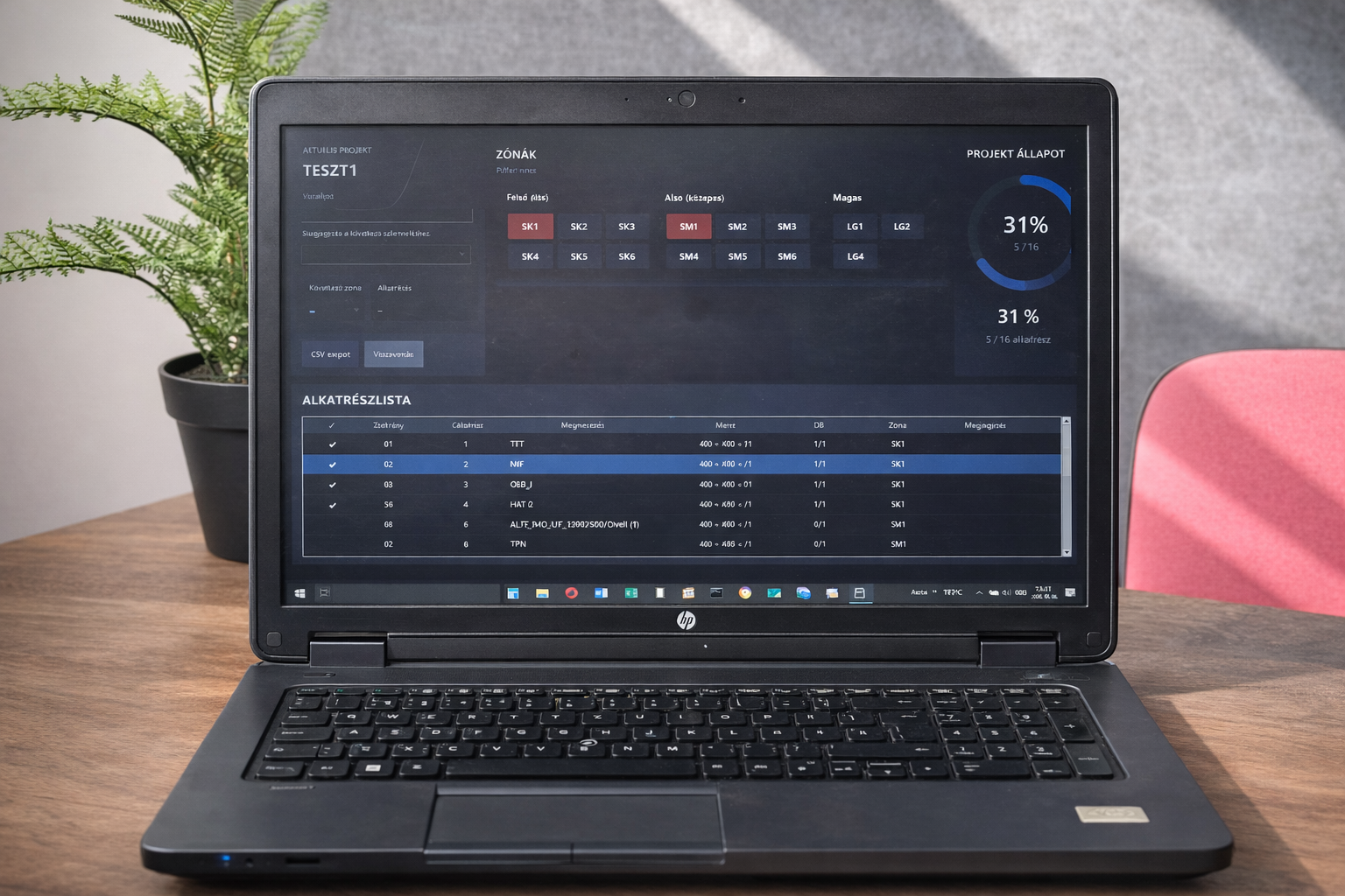 A fejlesztett szoftver valós időben mutatja az alkatrészlistát, a zónákat és az aktuális készültséget.